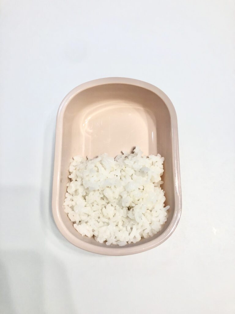 ④白いご飯でじぶんの好きなうさぎを作ります。上半分の空いた箇所に好きなおかずを詰め隙間を無くします。