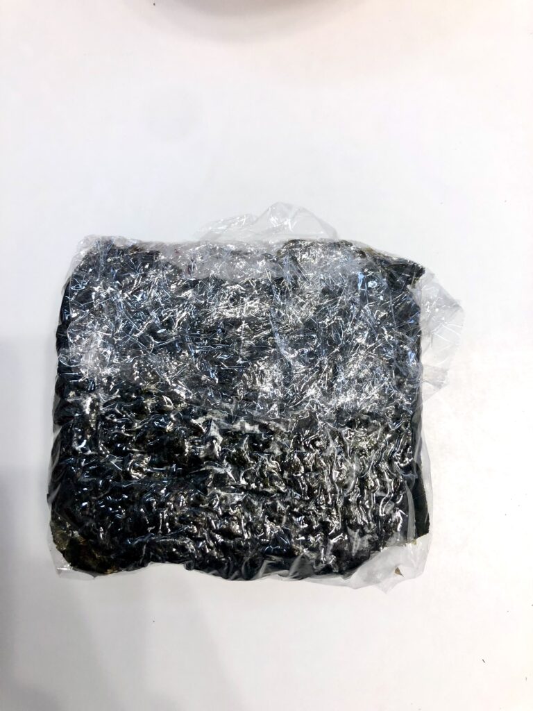 ②弁当箱の形になっているご飯を崩さないよう取り出しのりでコーテイング。ラップで馴染ませておきます。