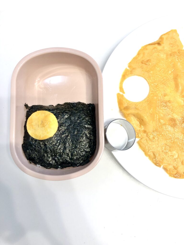 ③②を弁当箱に戻し、作りおきしていた薄焼きたまごを丸い型抜きで抜き月を作ります。