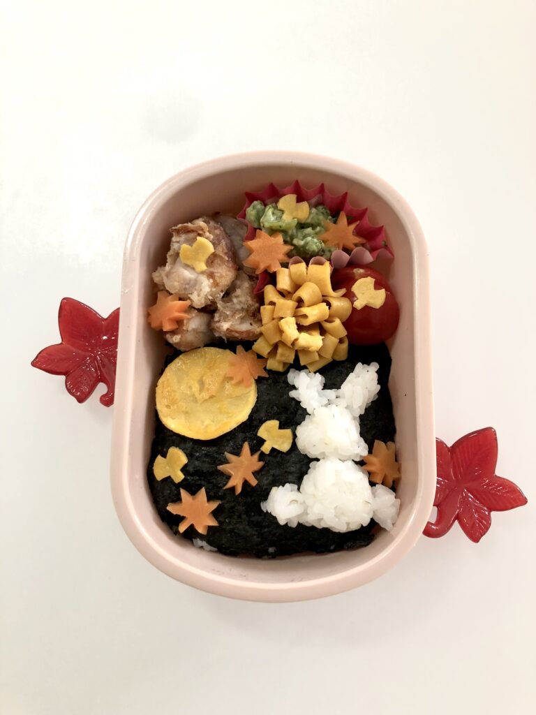 ⑤最後は、余った薄焼きたまごでイチョウを、にんじんで紅葉を作ります。自分は型抜きがなかったので、カッターでどちらも作りました✂️