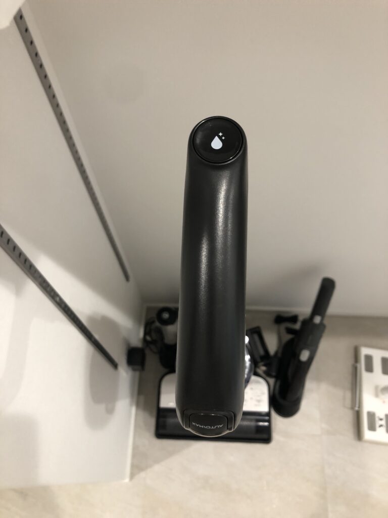 充電台に掃除機を戻し、持ち手の水滴のイラストが描いてあるボタンを押します。すると、自分で残りの洗浄液を使ってブラシローラー等をきれいにしてくれます✨