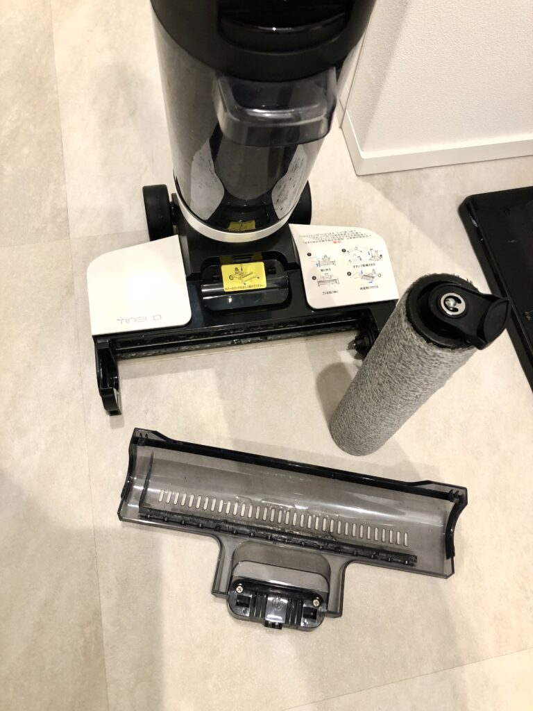 終了後は、カバーとブラシローラー汚水タンクを外しカバー裏や掃除機の下面に溜まったゴミの拭き取り、汚水タンクの処理をします。ブラシローラーは乾燥させるため充電台に専用の置き場所があるのでそこに設置し乾燥させます🍃